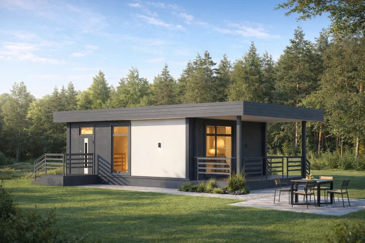 Домокомплект DOORHAN 59 ПРО — это компактный загородный дом для отдыха и сезонного проживания. Отдельная спальня формирует приватную зону, а кухня-гостиная позволяет нескольким людям комфортно проводить время вместе. В доме удобно отдыхать, готовить, смотреть телевизор или принимать гостей. Это формат современной продуманной дачи.